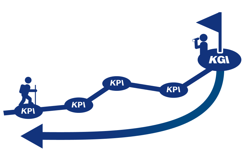 KPIとKGIはゴールまでの地図と現在地を示すコンパスのような関係にあります。KGI(Key Goal Indicator)は「最終的に到達したい山頂」を数値で表したもの。たとえば「年間売上1億円」や「月間リード100件」がそれに当たります。