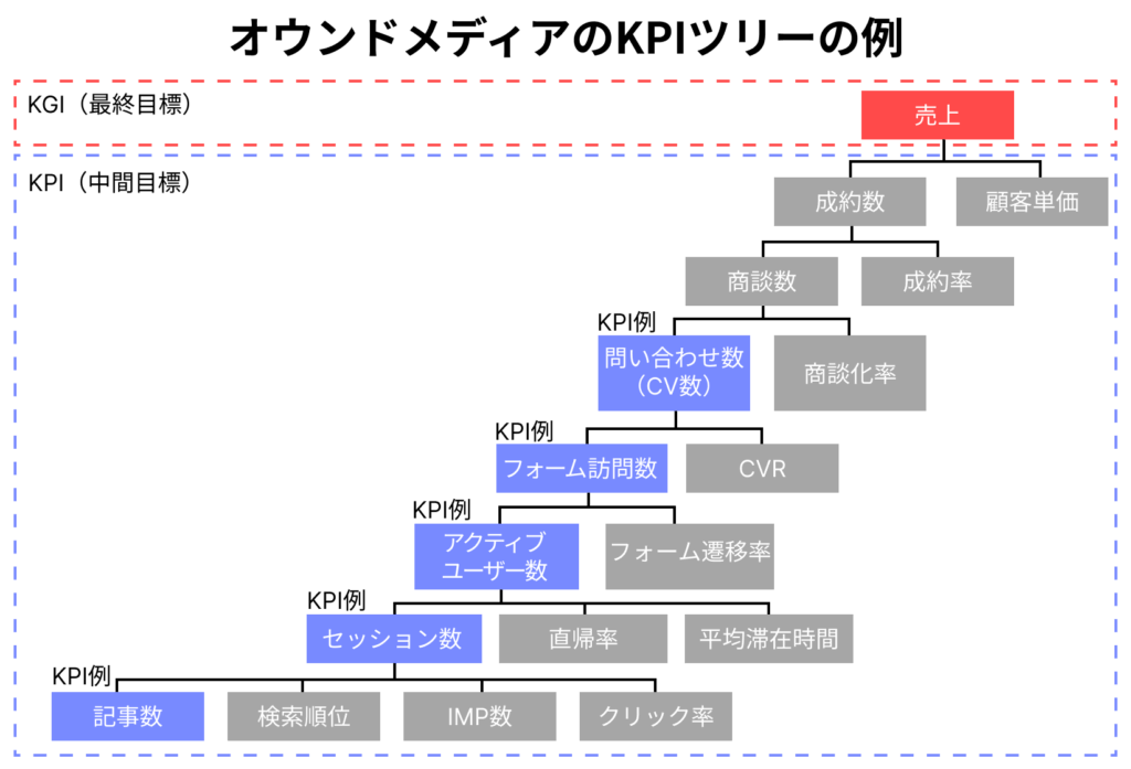 KPI例 | 「年間100件の問い合わせ獲得」 | 「月間10万PV」「月間資料DL数10件」 |