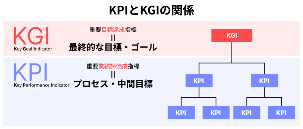 | 意味 | 最終的に達成すべきゴールを示す指標 | ゴール(KGI)達成のために追う中間指標 |