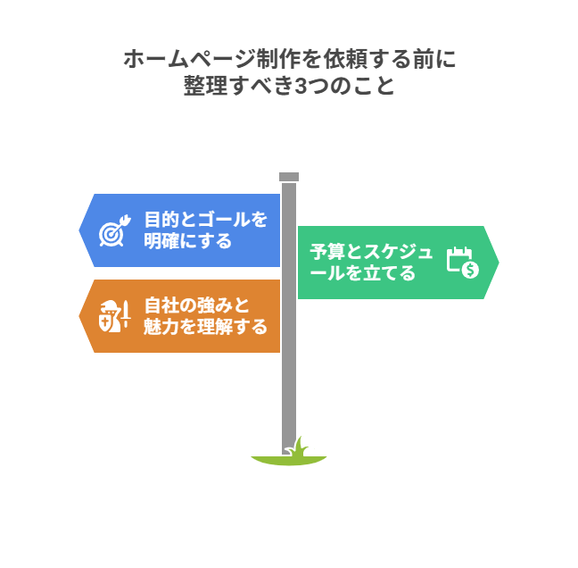 ホームページ制作を成功させるには、まず「なぜ作るのか」という目的とゴールを明確にすることが最も重要です。また、現実的なプロジェクト計画を立てるために、予算とスケジュールの目安を立て、自社の強みや魅力を整理しておくことも大切です。