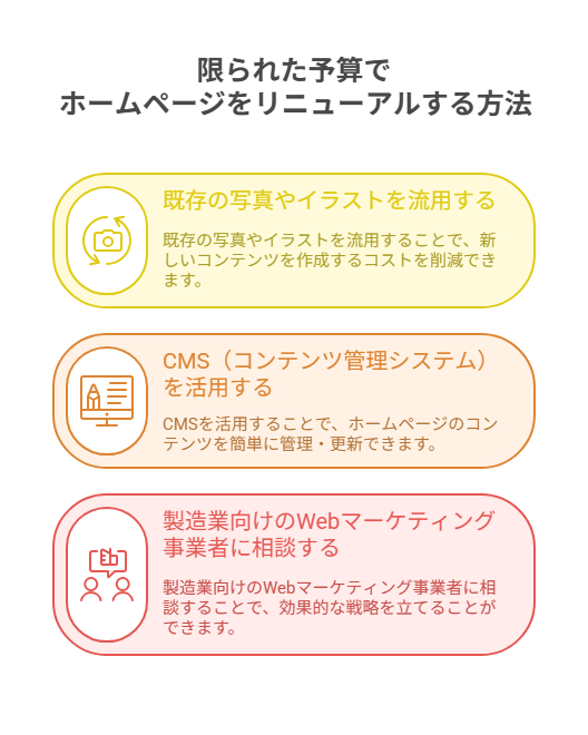 ホームページのリニューアルにあたって「十分な予算を確保することが難しい」という中小企業でも、制作や更新にかかるコストを抑える方法があります。