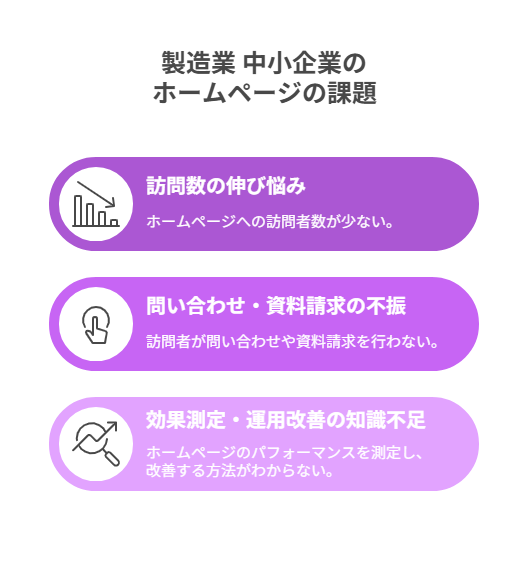 ホームページを運営しても、期待していた成果を得られないことがあります。製造業の中小企業が抱えやすい課題には、以下が挙げられます。