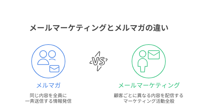 一般的には、メルマガ(メールマガジン)は「同じ内容を全員に一斉送信する情報発信」を指し、メールマーケティングは「顧客ごとに異なる内容を配信するマーケティング活動全般」を指すことが多いです。つまり、メルマガはメールマーケティングの手法の一つといえます。