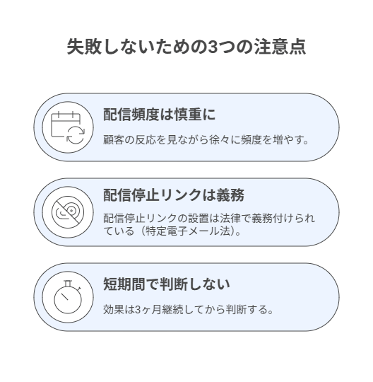 安易な運用やいきなりの高頻度配信は、担当者の業務負担を増やすだけでなく、顧客からの信頼喪失(配信停止)につながるリスクがあります。