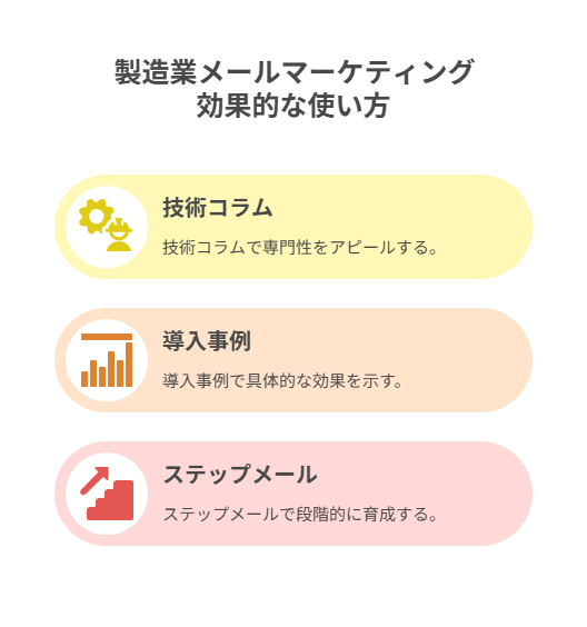 製造業がメールで成果を出す鍵は、単なる「売り込み」ではなく、「技術コラム」や「導入事例」を通じて、顧客の信頼を積み重ねることにあります。 「この会社は技術力がある」「実績が確かだ」と安心してもらうために、明日から使える3つの活用パターンをご紹介します。