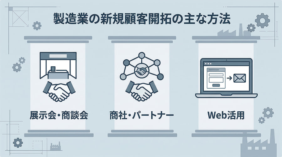 製造業の新規顧客開拓では、展示会や紹介だけでなく、Webも含めて接点づくりから商談化までを設計する視点が重要です。