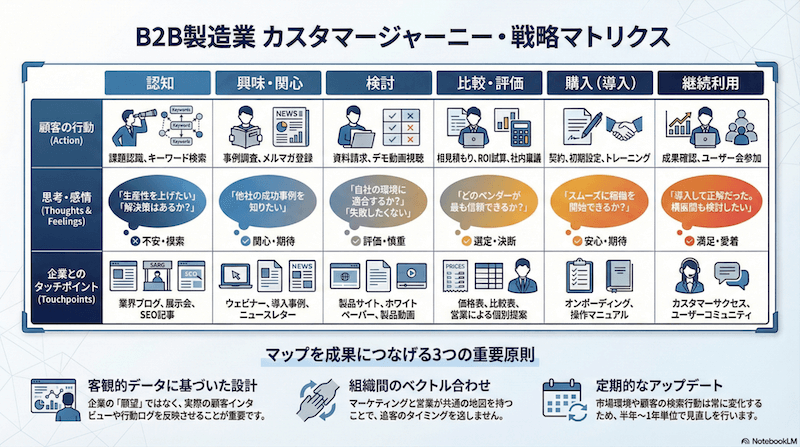 「稟議・社内説得」のフェーズを設ける: マップの段階に「比較・評価(稟議)」というBtoB特有のフェーズを組み込みます。その上で、現場担当者が上司を説得するための客観的な材料(費用対効果の試算シート、他社との比較表、導入事例など)を企業側から提供するような接点を設計します。