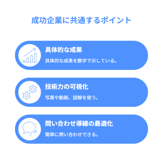 実際に成果を上げている製造業企業のホームページには、具体的な成果を数字で示す、技術力を可視化する、問い合わせ導線を最適化するなど戦略的な共通点があります。ここでは、成功企業に共通する3つのポイントを見ていきましょう。