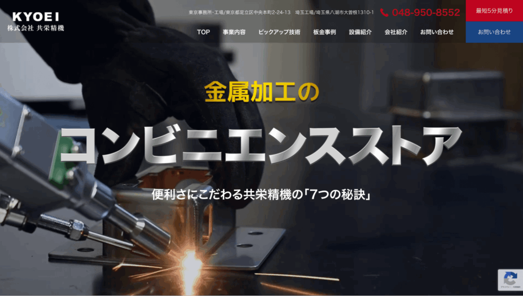 株式会社共栄精機は、レーザー加工・曲げ加工・溶接加工を中心とした高い加工技術を有する企業です。ホームページでは、「金属加工のコンビニエンスストア」という印象的なキャッチコピーを掲載しています。スピードと顧客への利便性をわかりやすく訴求している例と言えるでしょう。
