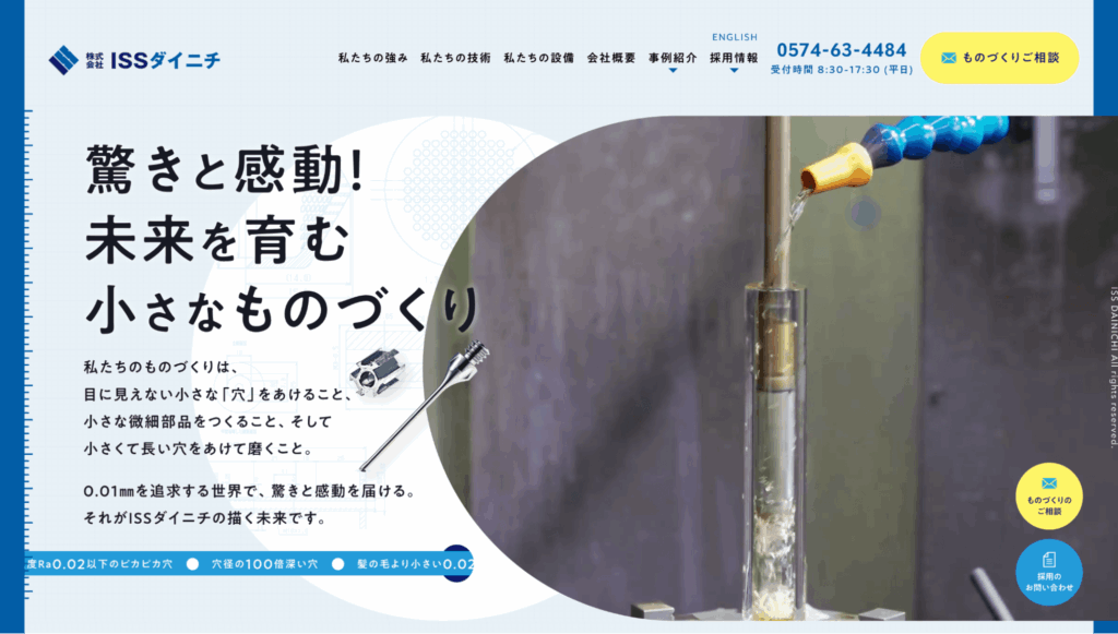 株式会社ISSダイニチは、超精密な金属加工、特に微細穴加工・深穴加工に強みを持つ企業です。同社のホームページは、青を基調にオレンジをアクセントにした色彩を採用。