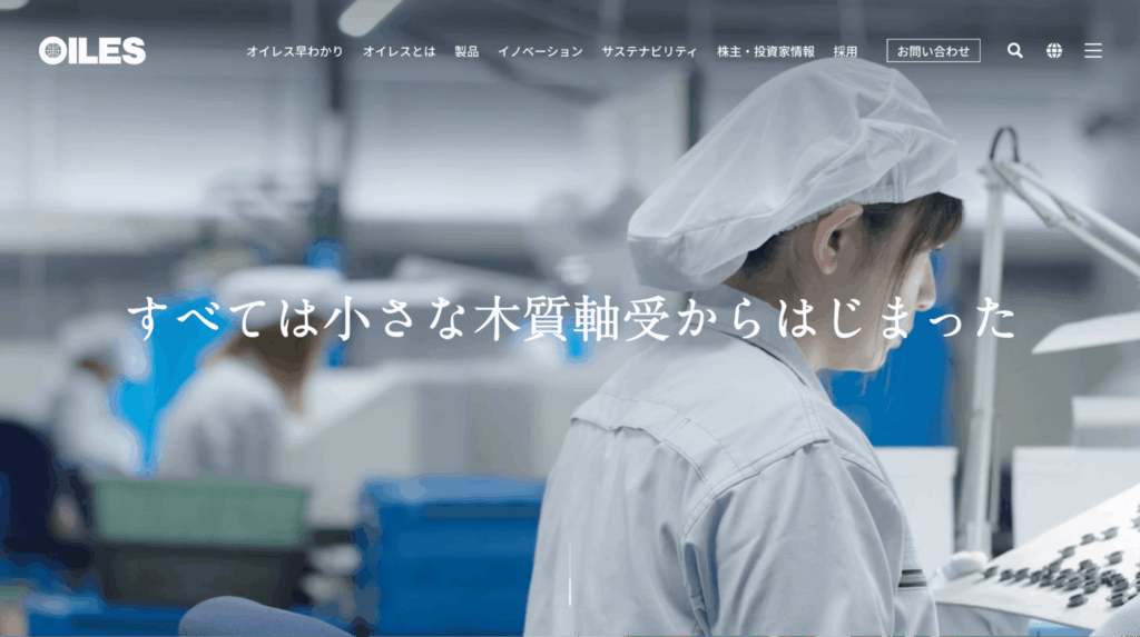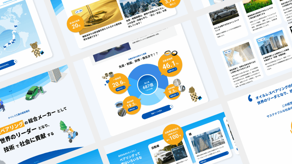 オイレス工業株式会社は、オイルレスベアリングや免震・制震装置を開発する総合メーカーです。サイト全体を通して動きのある表現を採用しています。