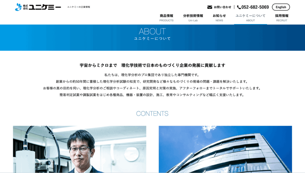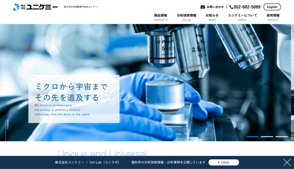 株式会社ユニケミーは、理化学技術に関する調査・研究・試験・測定・分析及び情報の提供を行っている企業です。1972年の設立以来、ものづくり企業が直面する課題解決や、環境保全に貢献する事業を展開しています。