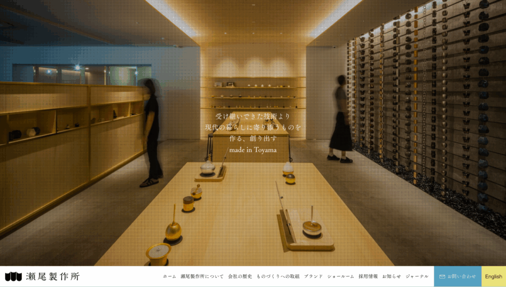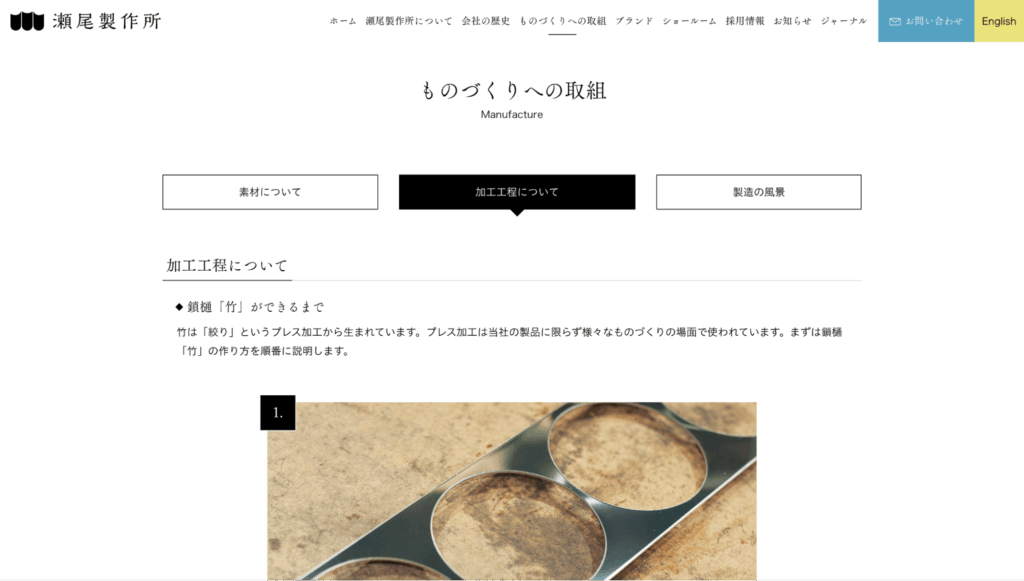 ホームページは、製造技術の背景にある「デザイン」と「ものづくり」へのこだわりを強く打ち出した、情緒的で洗練されたデザインが特徴です。見る人を惹きつける、高いブランドイメージを構築しています。