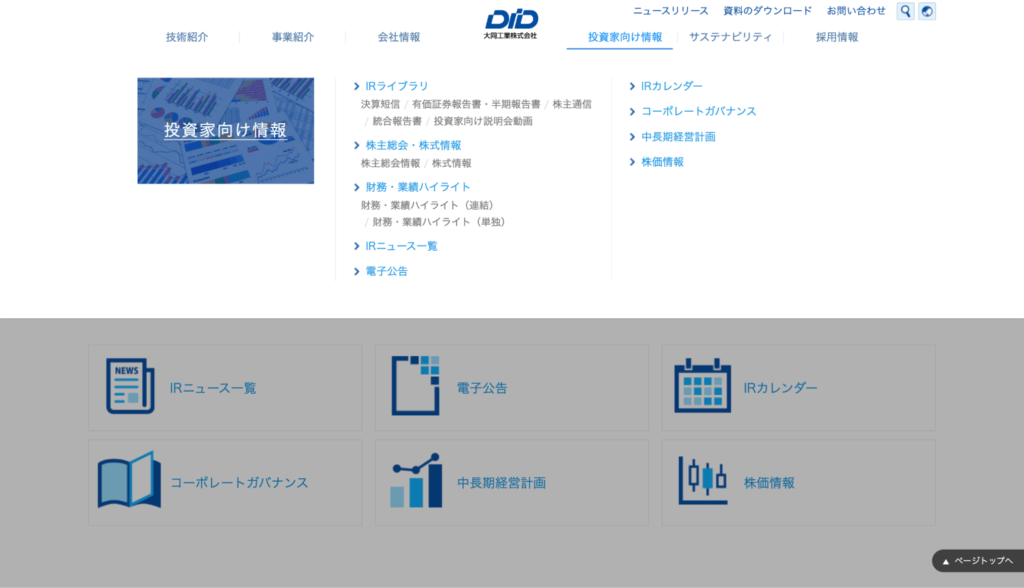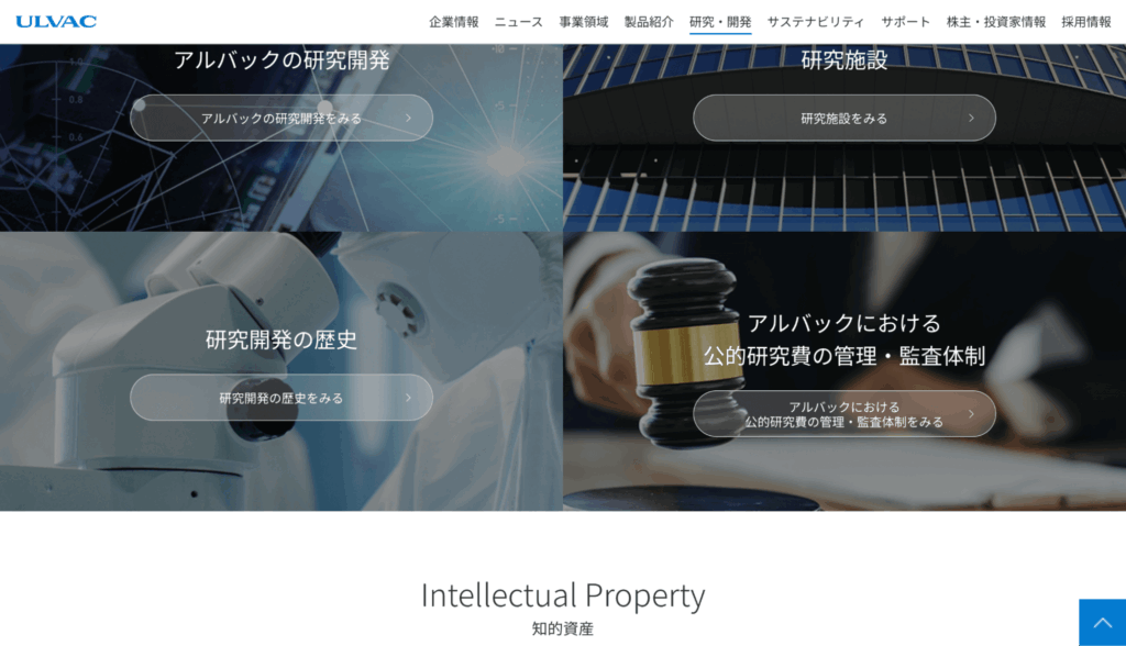 同社のホームページでは、青を基調とした清潔感のあるデザインを採用。製品写真やイラストが多く使われており、技術力や事業内容が明確に整理され、IR情報も充実しています。