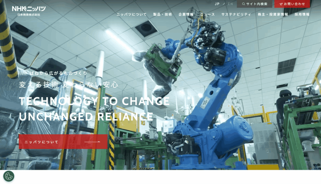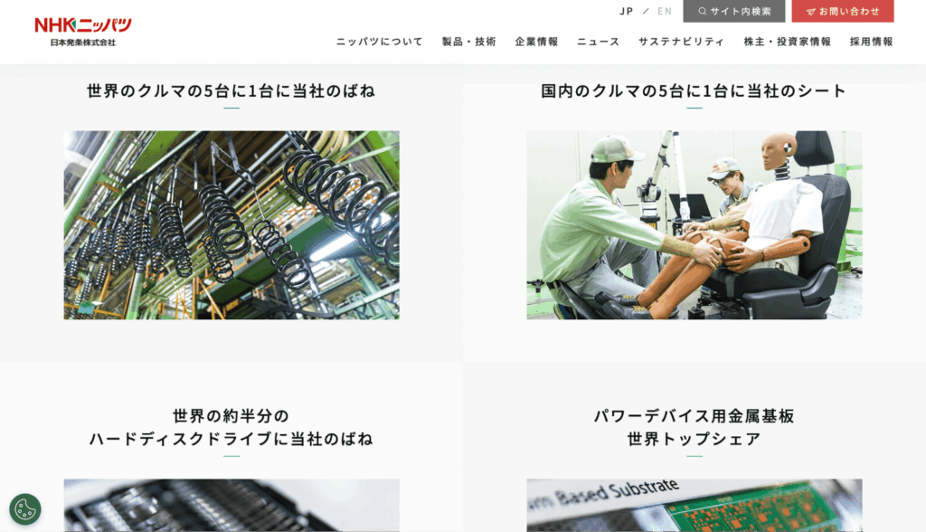 同社のホームページは、「ばね」というコア技術を基盤に、いかに大きな事業を展開しているかを伝えることに重点を置いた、信頼感と安定感のあるデザインが特徴です。
