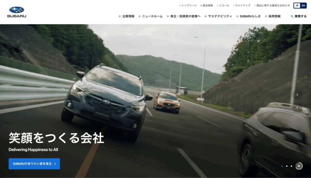 株式会社SUBARUは、自動車「SUBARU」の開発・製造・販売を行う企業です。同社のホームページは、「安心と安全」を核とするブランドイメージを体現し、ユーザーが必要な情報にアクセスしやすいように構成されています。