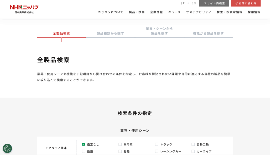 ナビゲーションの工夫として、「製品を探す」セクションで「製品種類」「業界・シーン」「機能」という複数の検索軸を用意し、多岐にわたる製品群の中からユーザーが目的の製品を見つけやすくしています。