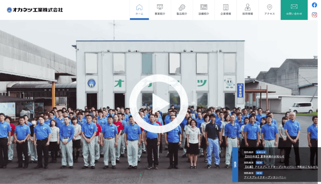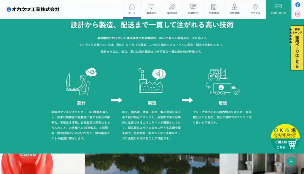 公式ホームページは、設計から物流まで社内で完結する「一貫生産体制」が強みとして強調。企業情報や採用情報に加え、社内報や製品詳細、SNS連携といった多岐にわたる情報を提供しています。