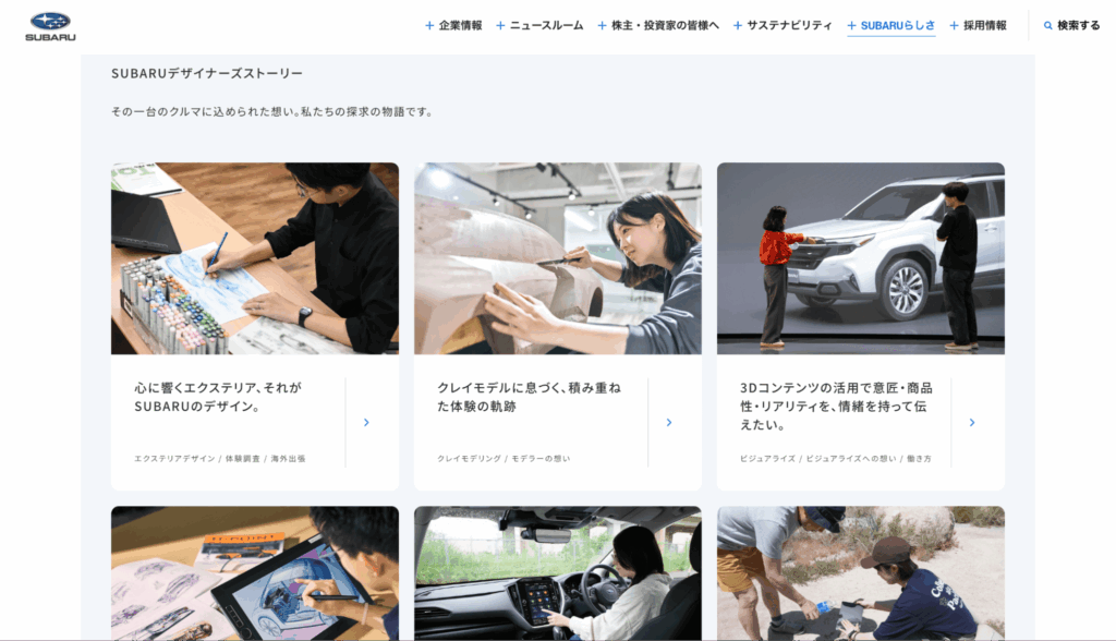 ナビゲーションは、「企業情報」「株主・投資家」「サステナビリティ」「SUBARUらしさ」といった、あらゆる側面からの企業情報を網羅。ユーザーが自身の目的に合わせて迷わず情報にアクセスできるよう、グローバルメニューが緻密に設計されています。