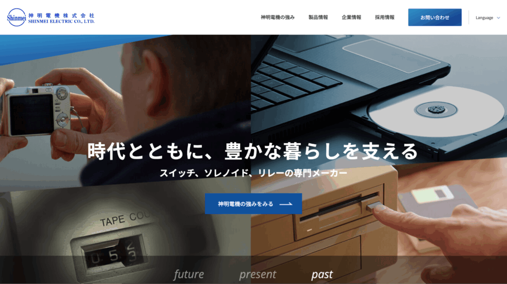 神明電機株式会社は、スイッチ・ソレノイド・リレー製品を製造する企業です。シンプルな印象に仕上げつつ、TOPページでは斜めのラインを取り入れることで動きを演出。各装飾にブルーが積極的に取り入れられており、企業の誠実さが伝わるデザインです。