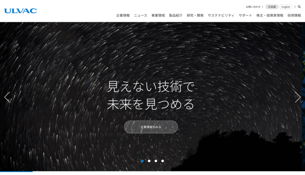 ホームページのデザインは、濃い青をメインカラーとし、白とのコントラストで専門的かつ堅実なイメージを醸成しています。ファーストビジュアルには「ミクロから宇宙まで その先を追及する」というメッセージを掲載。同社が手掛ける事業のスケールの大きさを感じさせます。