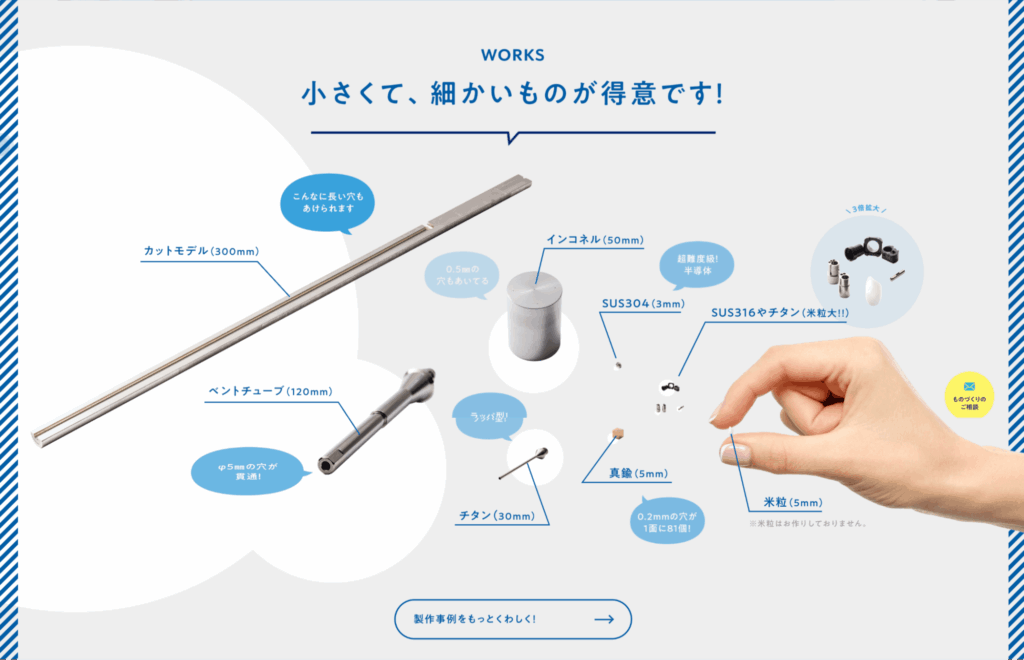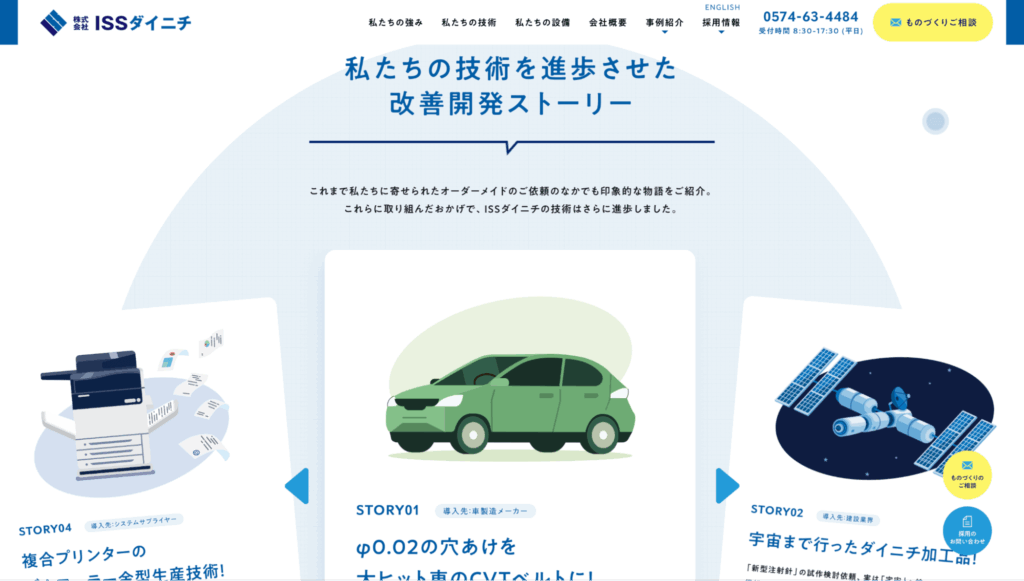 加工風景の動画や米粒大の製品の事例写真など、視覚的に技術力の高さを伝えています。「開発ストーリー」セクションは、カードのようなパーツデザインが印象的です。難題を解決した顧客事例を開発背景とともに紹介して、技術力だけでなく企業の挑戦的な姿勢についても発信しています。