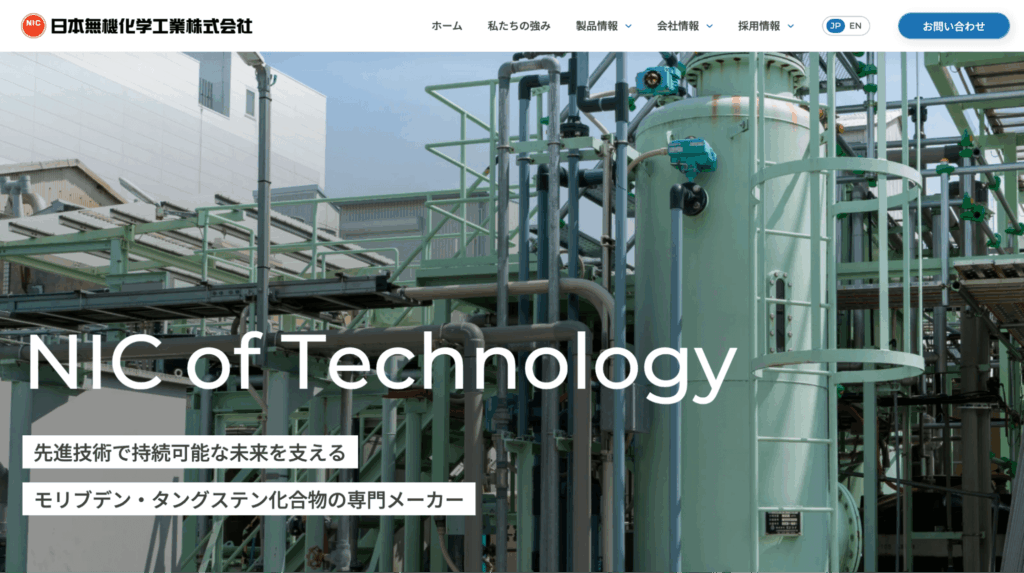 日本無機化学工業株式会社は、モリブデン・タングステン化合物やヘテロポリ酸など、高付加価値商品を中心とした工業薬品の製造・販売に特化した専門メーカーです。