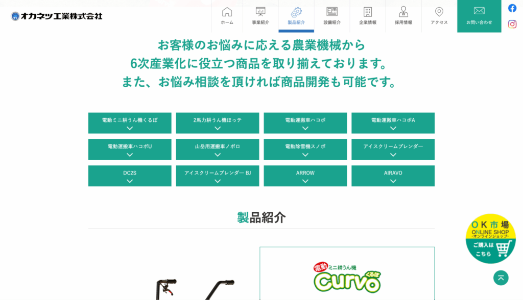 デザインは、白を基調に、自社製品の色にも採用されている鮮やかなグリーンをアクセントカラーとして多用し、農業機械分野の活気と親しみやすい企業イメージを演出。また、下層ページでは設備情報を掲載しており、生産能力・技術力の高さを発信しています。