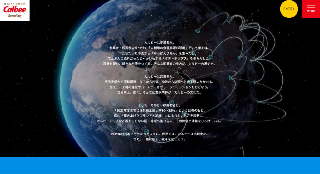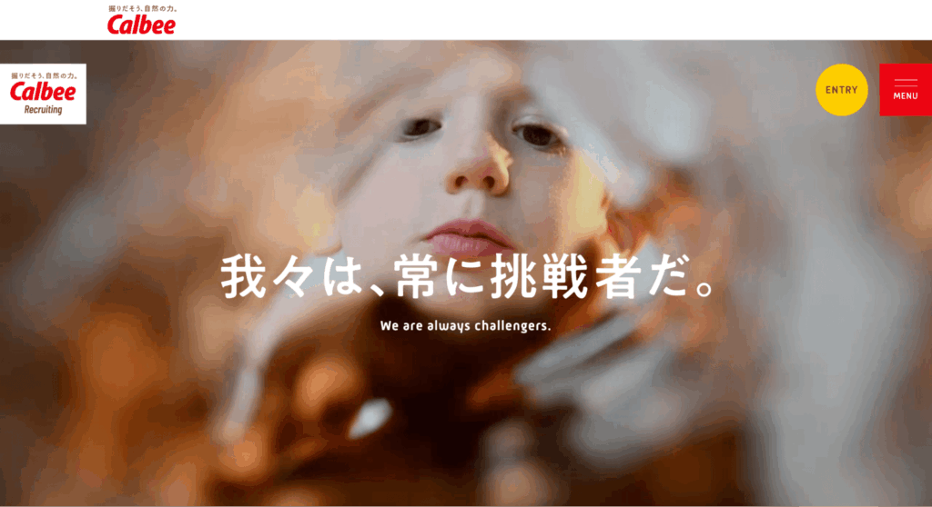同社の採用ページは、「カルビーは変革者だ」「起業家だ」「挑戦者だ」という3つのアイデンティティを歴史的事実とともに力強く語るストーリーテリングが印象的です。