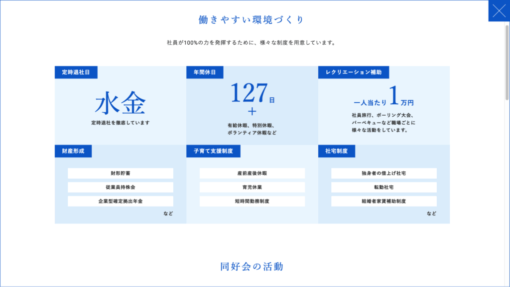 同社の採用サイトでは、ページ遷移を発生させない形を取り入れています。こちらの画面上の右上に配置された「×(閉じる)ボタン」を押下すると、情報が表示された窓が閉じるような仕掛けが施されています。