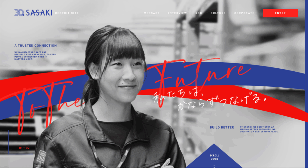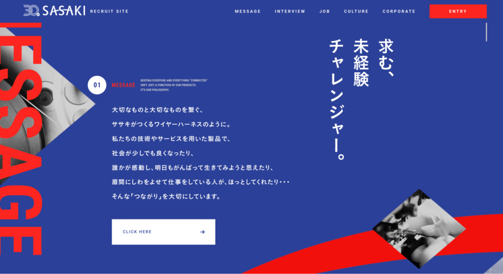 株式会社ササキは、高信頼性ワイヤーハーネス(電線の束)や電子機器の組み立てといった事業を展開する企業です。採用ページでは、ファーストビューエリアに、求職者の印象に残るような力強いメッセージを配置。掲載されている写真には色調整が施されており、メッセージの邪魔をしないよう工夫が感じられます。