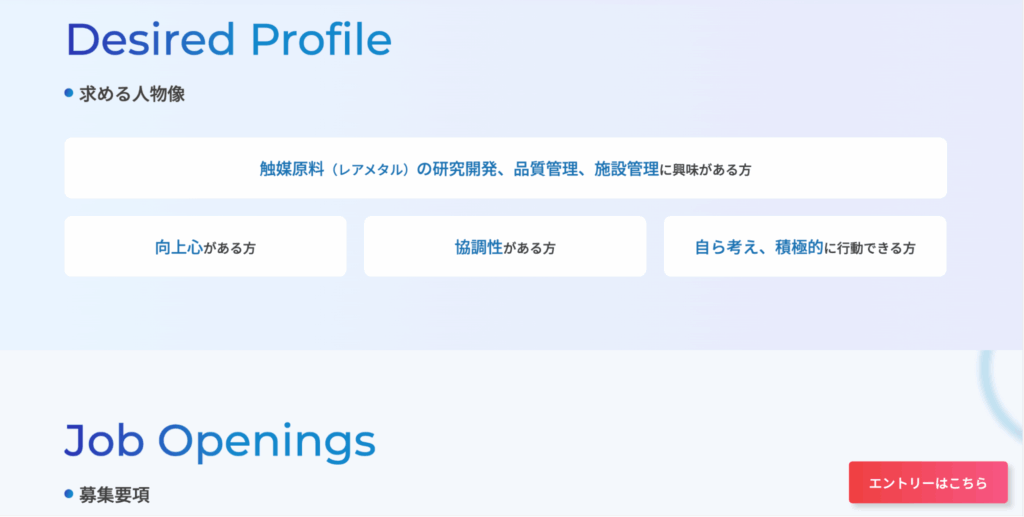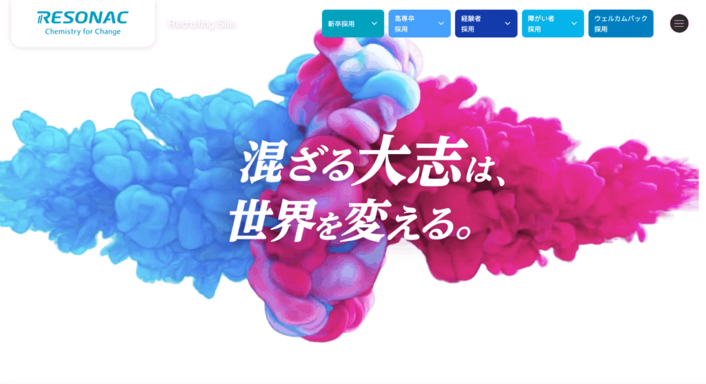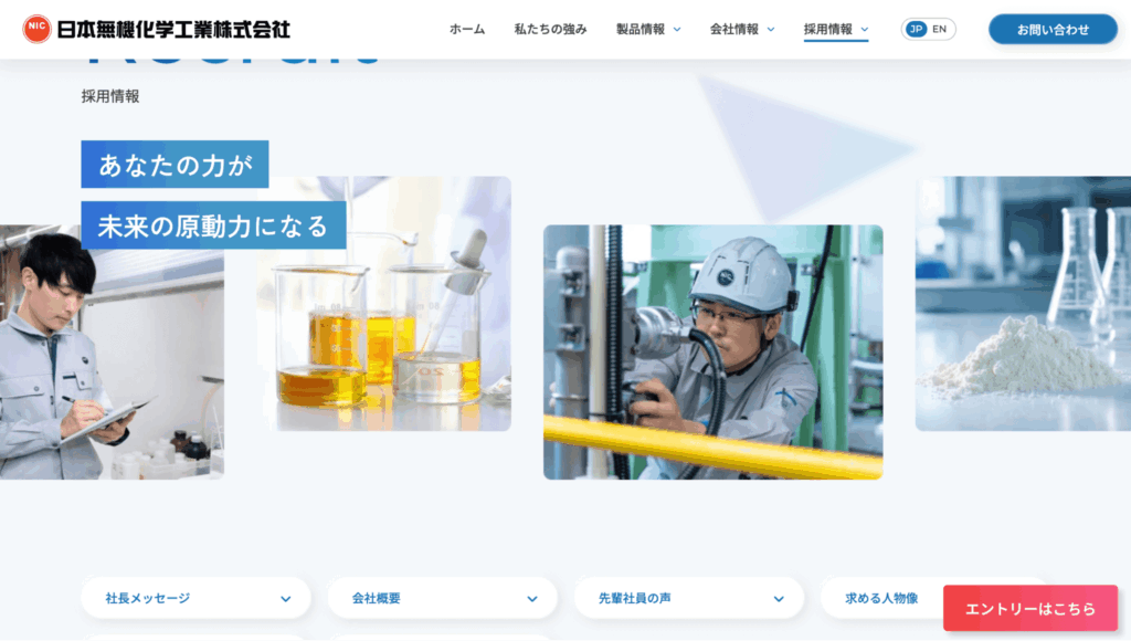 採用ページにおいては、力強いメッセージとともに、製造業らしい写真を掲載。装飾を最低限にすることで、企業が見てほしい情報に集中してもらいやすい工夫が施されています。