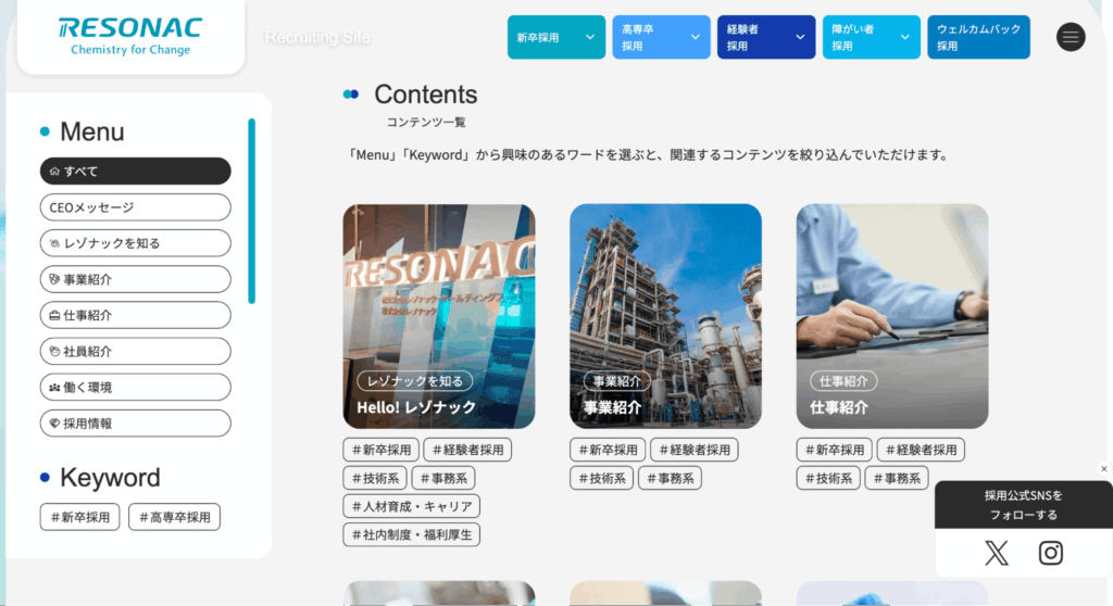同社の採用ページにおいて特に注目すべきは、コンテンツ一覧のセクションです。採用に関するコンテンツが大変充実していますが、フィルター機能を導入することで、豊富な情報の中から気になるコンテンツに辿り着けるように設計されています。採用に関する情報が増えてきたときに思い出したい参考例の1つです。