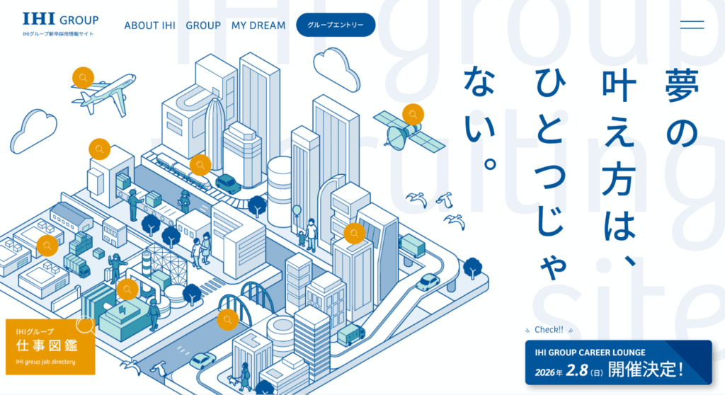 「早わかり!IHIグループ」では、丁寧な情報提供に重点が置かれ、このページの下部には、事業領域やグループ会社といった具体的な事業を説明するコンテンツへの導線が充実。興味のある分野に辿り着いてもらうための工夫が感じられる設計です。