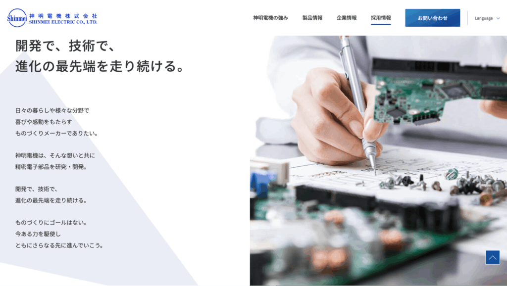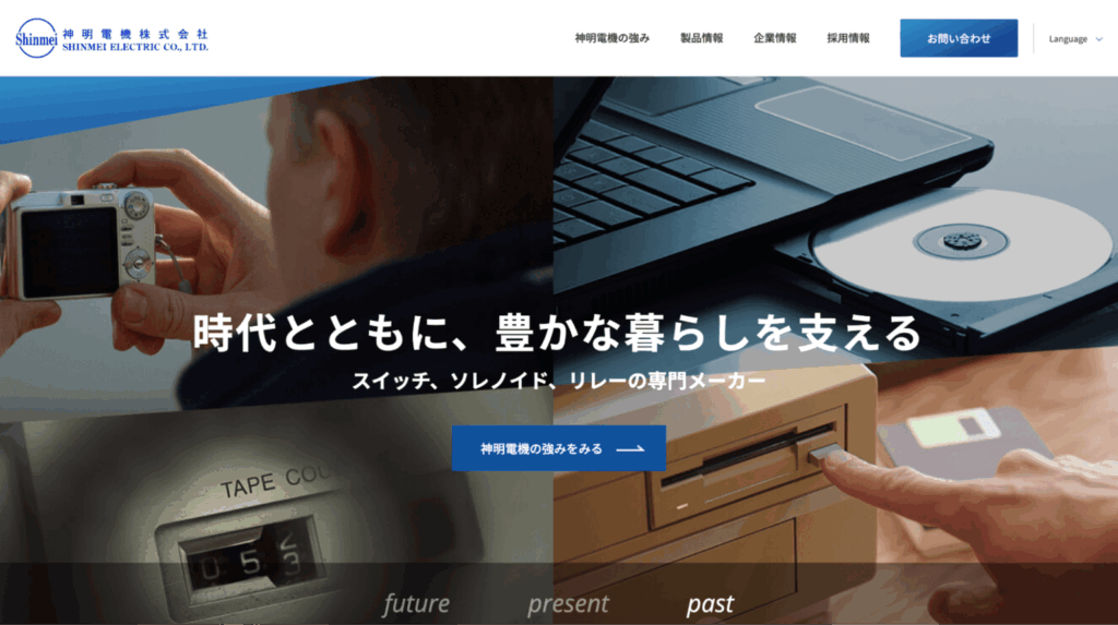 神明電機株式会社は、スイッチ・ソレノイド・リレー製品を製造する企業です。同社のホームページは、ナビゲーションをシンプルにまとめて、ユーザーが閲覧したい情報にスムーズに到達できるように整備されています。
