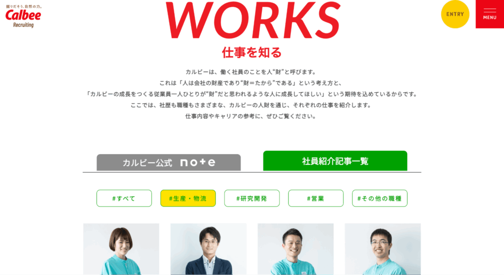 「仕事を知る」ページでは、社員紹介記事が多数公開されており、職種ごとに整理されています。この部分は、検索性が高く参考になる点です。セクション上部にインタビュー職種ごとのフィルター機能が設置されており、気になる職種だけを表示できる仕様を実現。効率的な情報収集を実現しています。