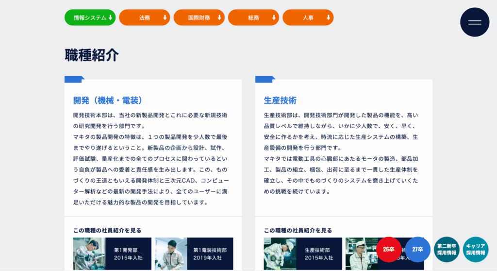 「マキタの部門と職種」ページでは、マキタで就ける仕事を整理して見せるといった「職種カタログ」のような構成を採用。技術系・事務系それぞれの役割を具体的にイメージしてもらえるように社員紹介と共に説明が記載されています。